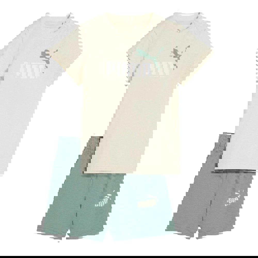 This Puma Kids Minicats Essential set includes one T-shirt and one pair of shorts in beige. Made from cotton and recycled materials, it has a soft handle and a regular fit. The T-shirt is finished with a logo design and a ribbed crew neckline, paired with short sleeves for a clean, simple look.