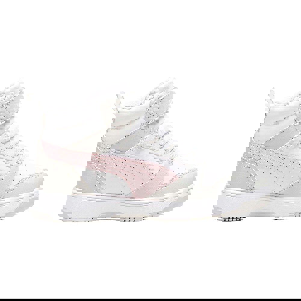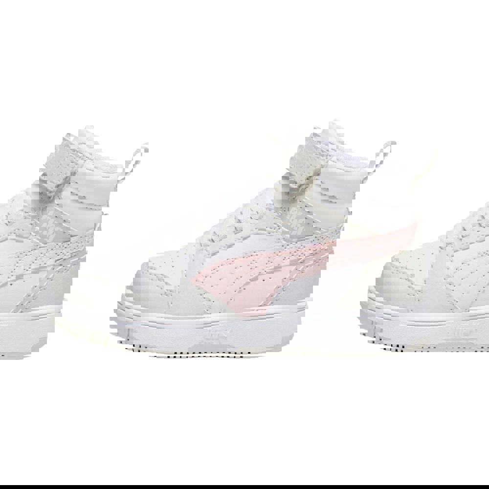 Puma Kids Rebound V6 Mid Leather Trainers in white and pink combine a synthetic leather upper with a Softfoam+ and textile lining. A rubber outsole and flat profile keep the finish clean and practical, while the round toe maintains a classic trainer shape. The low cut is paired with a lace-up front and a touch fastening strap for a secure, adjustable fit. Logo detailing completes the look.