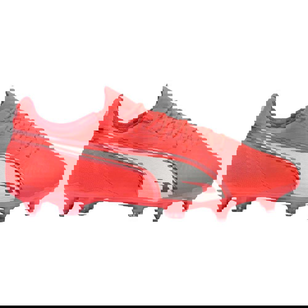 The Puma Mens King Match Soft Ground Football Boots are designed for lace-up wear, with a low-cut profile and a round toe shape. Finished in red with contrast detailing and logo accents, they offer a clean, sporty look that pairs easily with your kit.