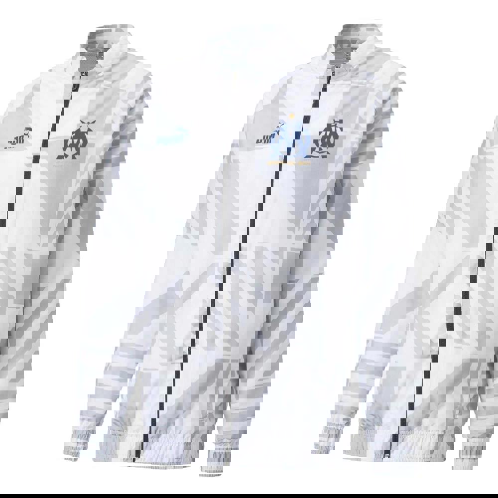 This men’s pre-match track jacket from Puma is officially licensed for Olympique de Marseille FC. Made from 100% polyester, it has a geometric logo design and long raglan sleeves for a clean, sporty look. A standing collar and full zip fastening keep the finish streamlined, while elasticated cuffs and an elasticated hem provide a secure feel.