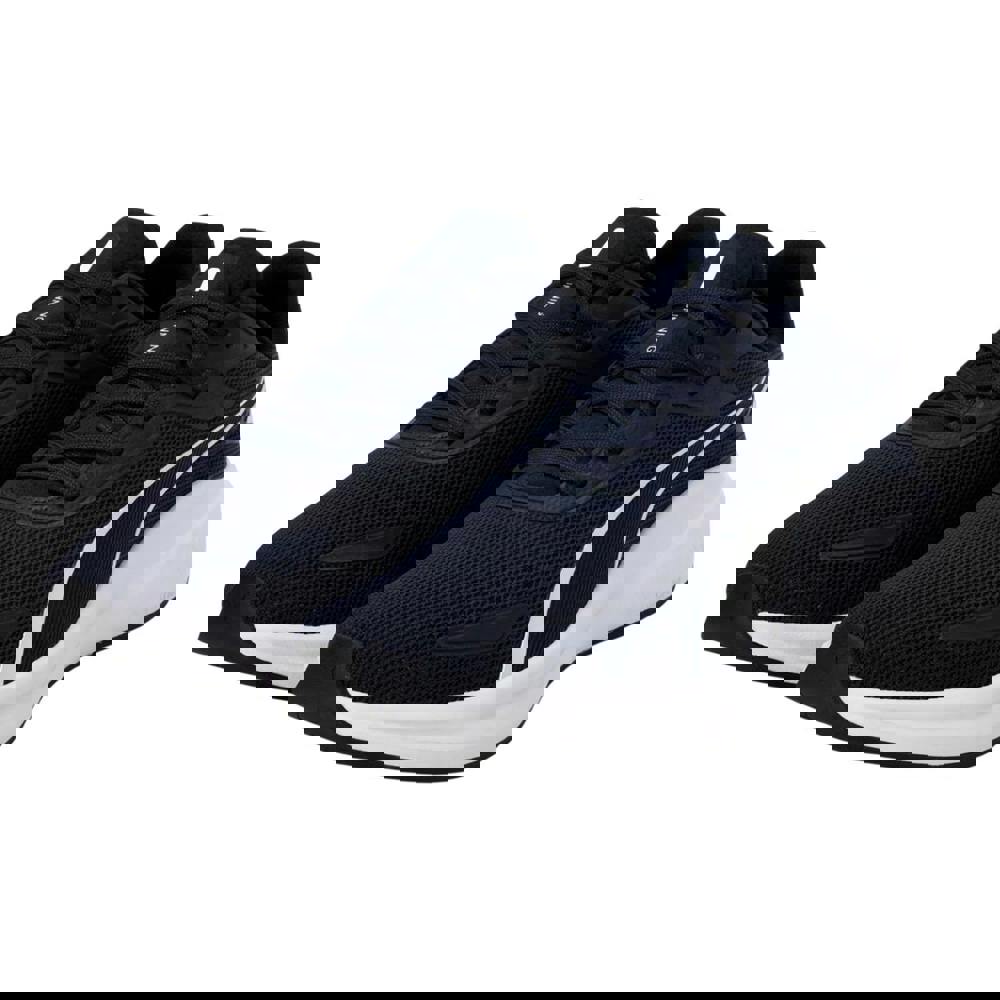 Puma Skyrocket Lite trainers in navy and white with a low-cut profile and round toe. The upper is knitted textile, paired with a synthetic lining, insole and midsole. A lace-up fastening runs through six eyelets, finished with a branded pull tab for added detail. PumaLite fabric technology is included as specified.