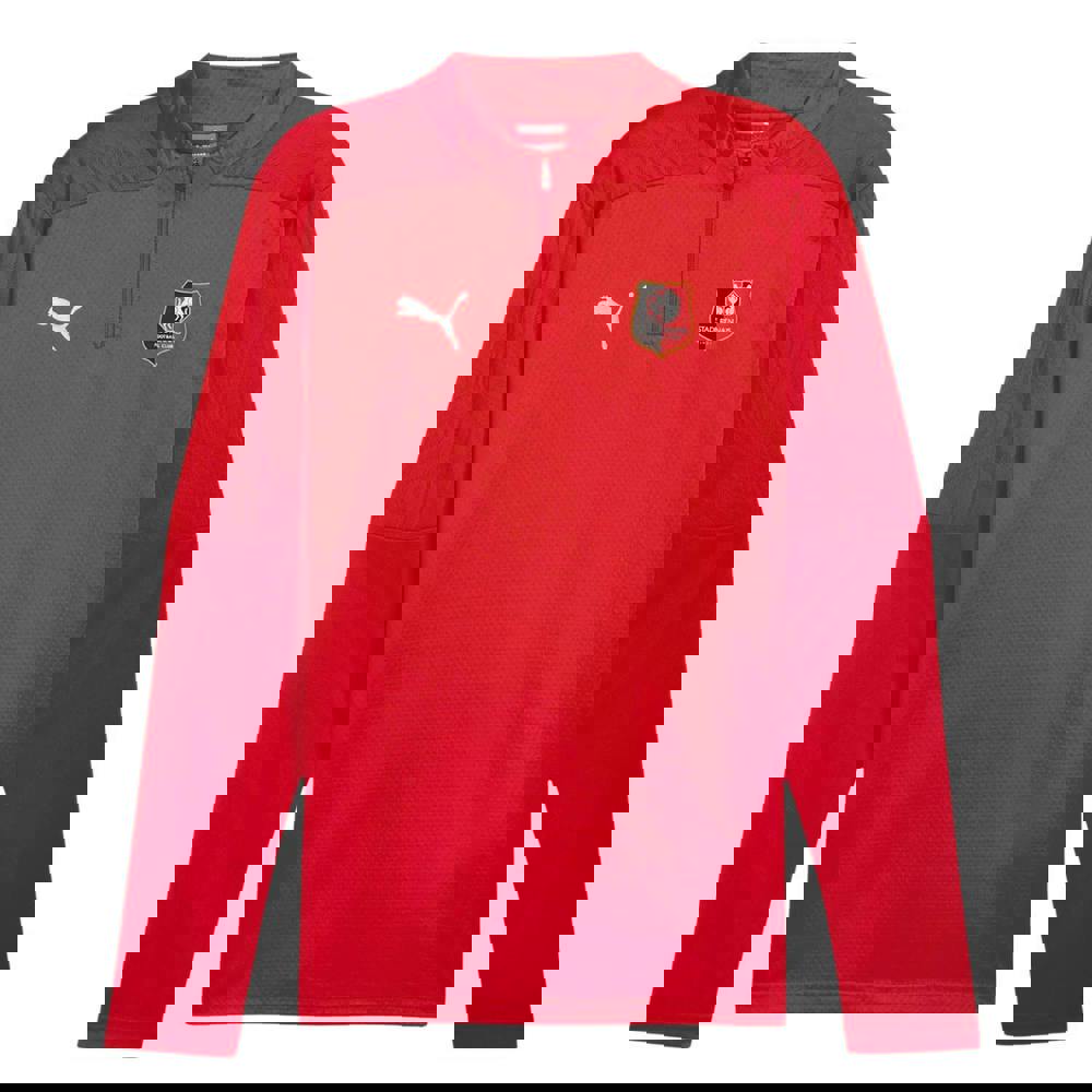 This Puma men’s Stade Rennais FC training top comes in red with a quarter zip fastening and a standing collar. It has long sleeves and a crest and logo design for a clear club look. Made from 100% polyester, it uses DryCELL fabric technology.