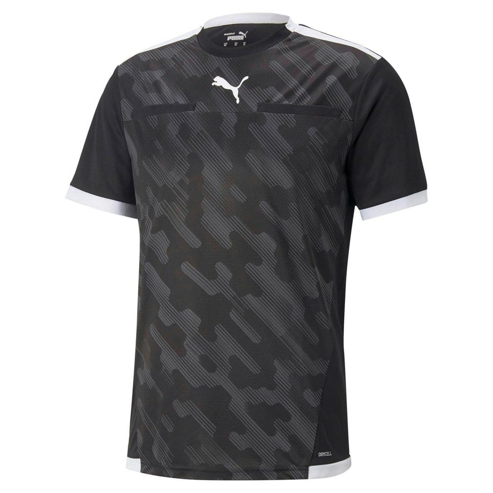 Made from 100% polyester, this Puma TeamLIGA football referee jersey is finished in black with a logo design. It is cut with a crew neckline and short sleeves for a clean, sport-focused look. The fabric uses breathable, DryCELL and lightweight technology.