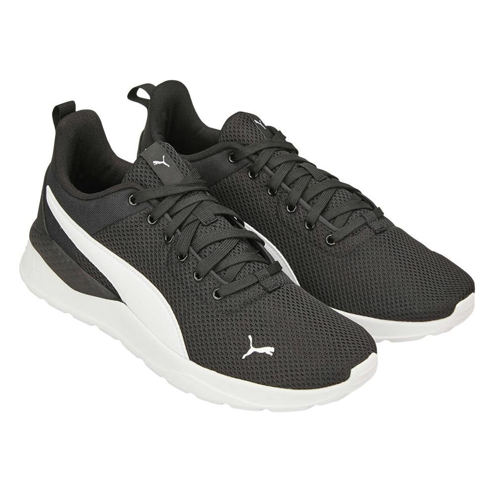 Puma Anzarun Lite trainers in black and white with a low-cut profile and low heel. The upper combines mesh and synthetic materials, finished with contrast detailing and logo branding. A lace-up fastening secures the fit, while a pull tab supports easy on and off.