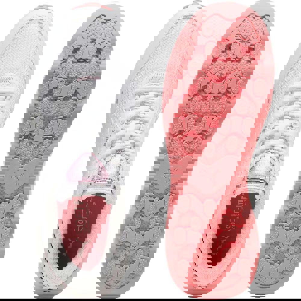 Puma Runtamed GirlPower platform trainers in white with a low-cut profile and plain finish. The upper combines synthetic and textile materials, paired with a soft textile lining and a foam insole. A mesh sock liner and topstitched detailing complete the construction.