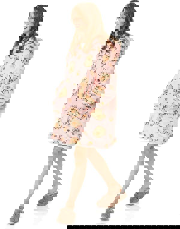 The oversized fit means there's plenty of room to snuggle up, while the delightful pink design features everyone's favourite tabby cat indulging in her favourite pastime; snacking! With its big kangaroo pocket, there's ample space for storing essentials like snacks, a favourite book, or maybe even a sneaky cat toy for when they're channeling their inner Pusheen