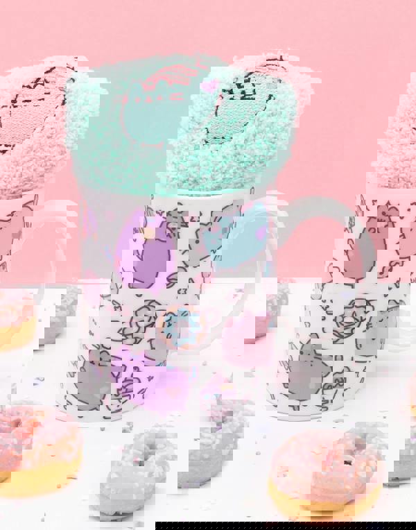 Get the most adorable gift for anyone who loves the animated grey tabby cat with this pastel Pusheen mug and fluffy sock set! Officially licensed and exclusive to Vanilla Underground, the cup and slipper socks set for girls and women features the dreamy cartoon cat surrounded by her favourite sweet treats - perfect for Christmas and birthday presents