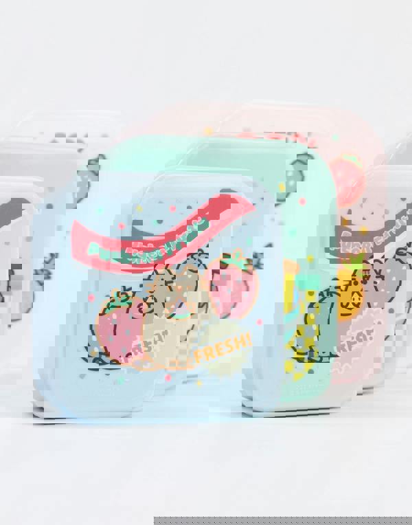 This snack pot set features an eye-catching pastel palette of light blue, pink, and mint green, each adorned with charming cartoon designs of fresh fruits, accompanied by the phrase "Pusheen Fruits, Fresh, 100% Sweet."