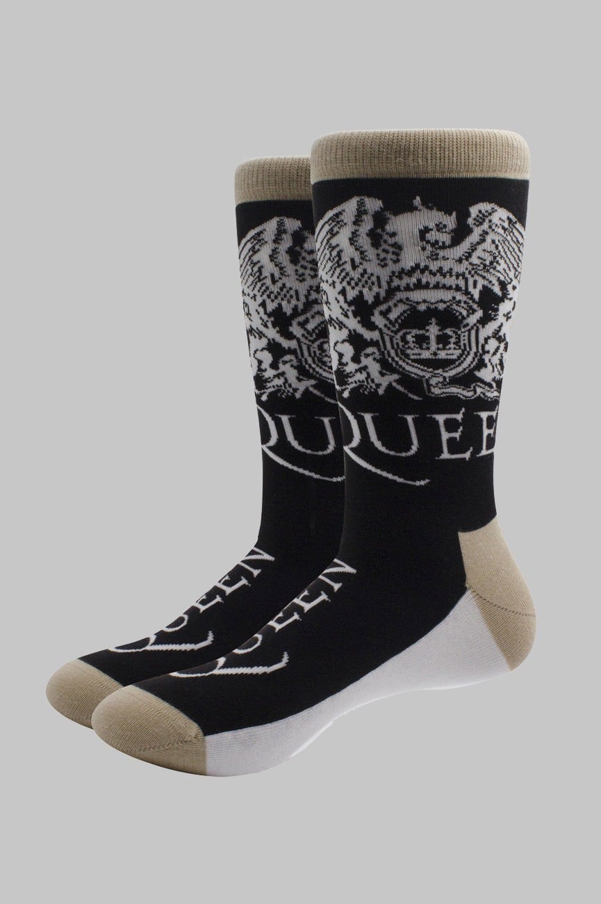 Official licensed Queen Ankle Socks featuring the 'Crest & Logo' design motif. This high quality hosiery is available in a black colourway. High quality all-over pattern woven socks. UK adult shoe sizes approx. 7 - 11 (EUR Shoe size 40 - 45 and US Men's Shoe Size 8 - 12).