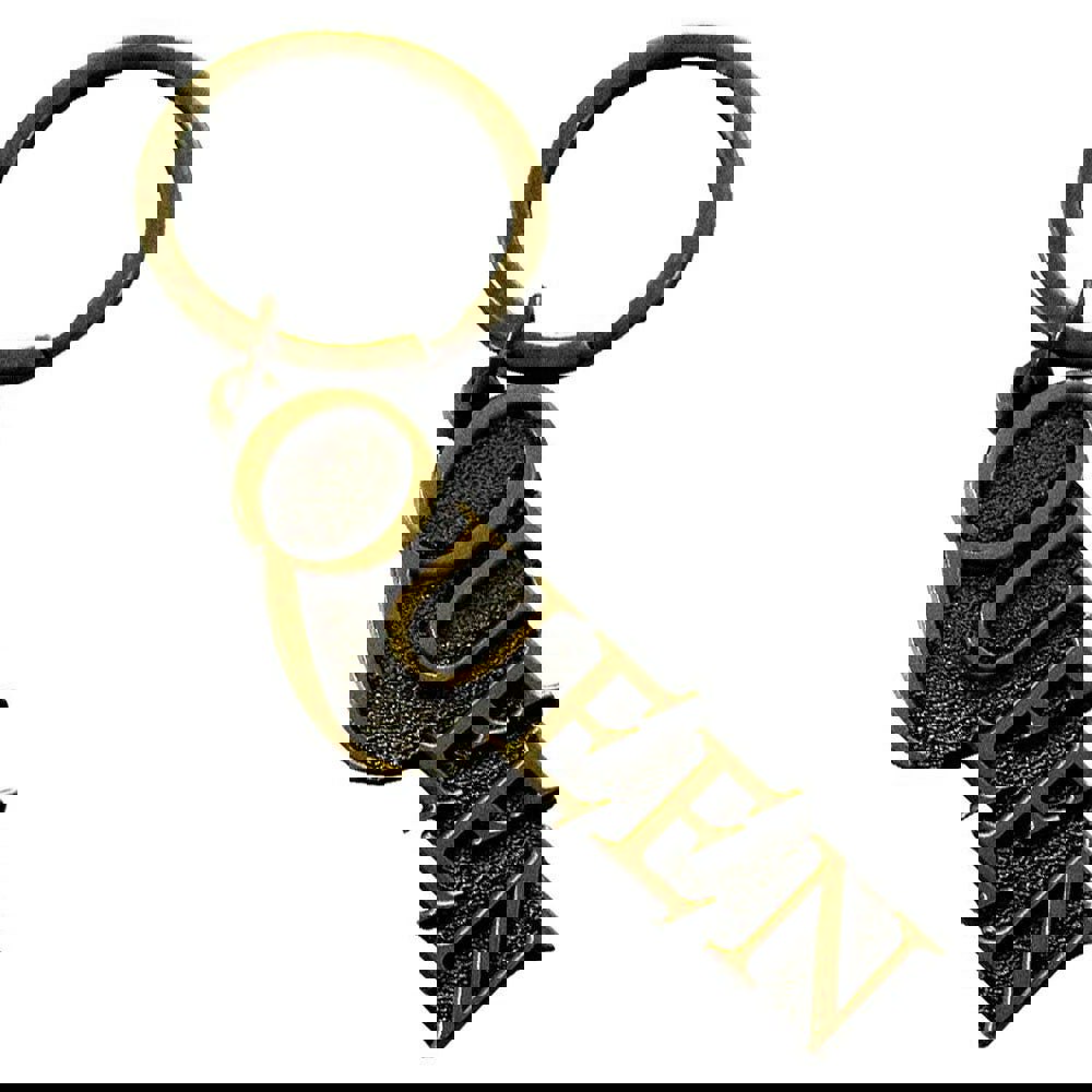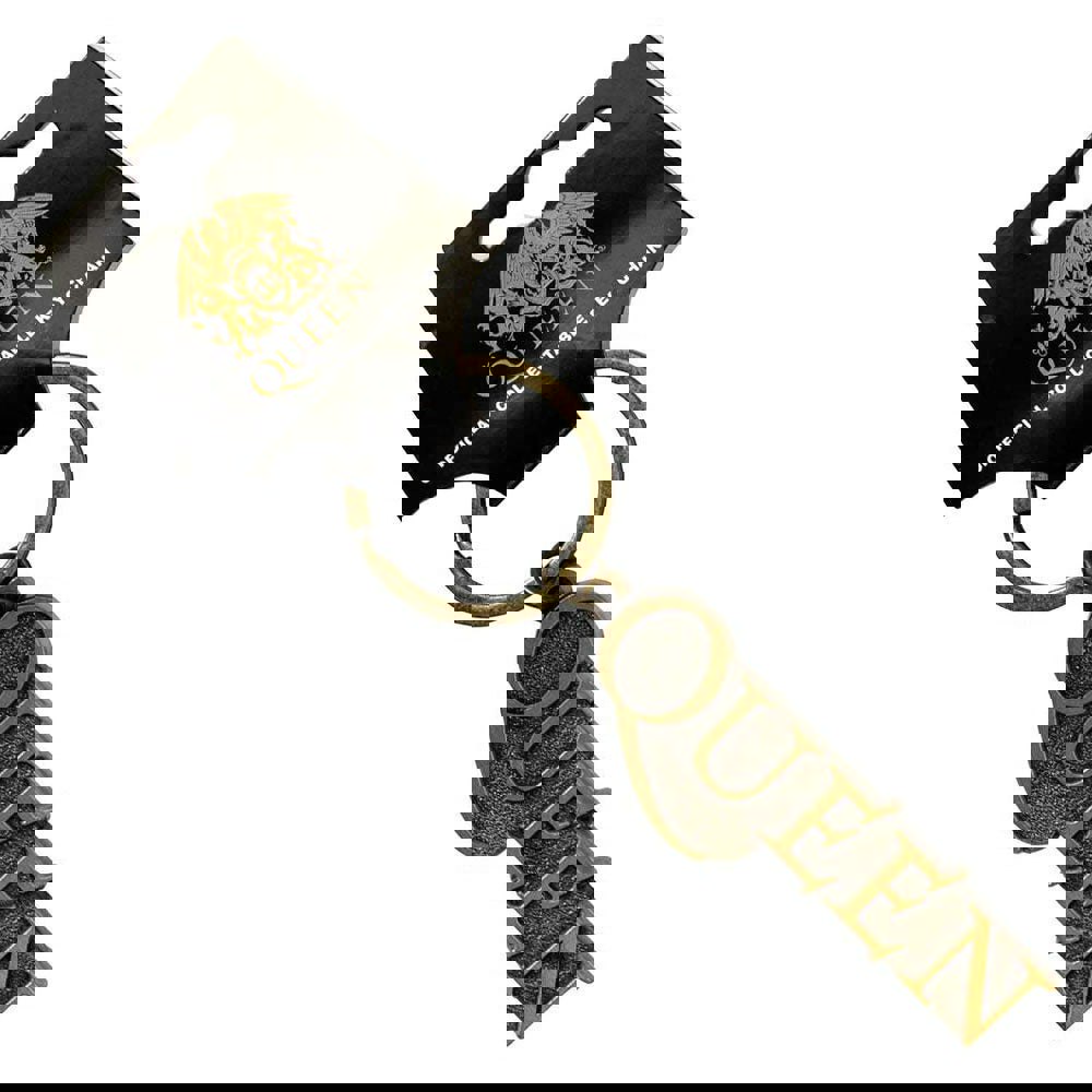 Official licensed Queen Keychain featuring the 'Gold Logo' design motif. High quality zinc alloy keychain featuring none enamel, die casting, antique gold coloured plating.