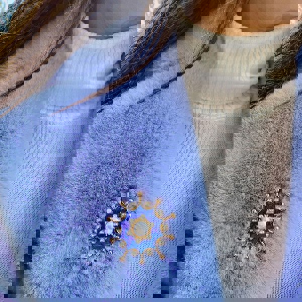 Our pearl pin is inspired by the night sky, and looks luminous worn with a gold dress for a sumptuous night under the stars. As you can see from our images, it is a pearl brooch that works equally well with a vintage inspired day dress. For maximum charm, wear your blue brooch with a blue dress, and a blue-sky smile.