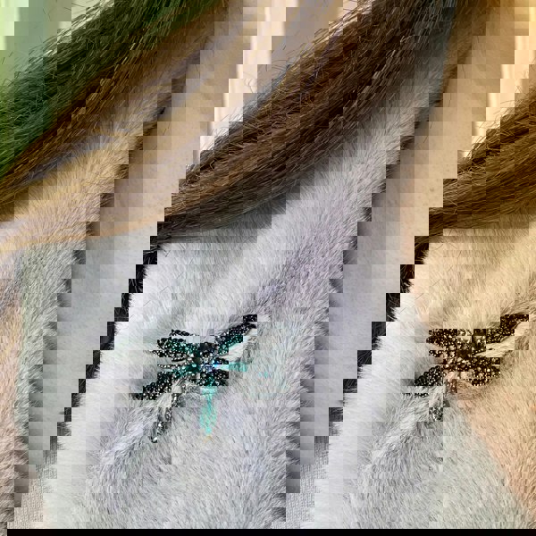 Our Blue dragonfly brooch is adorned with a central rhinestone, offset by smaller diamante, to compliment the filigree dragonfly wings.