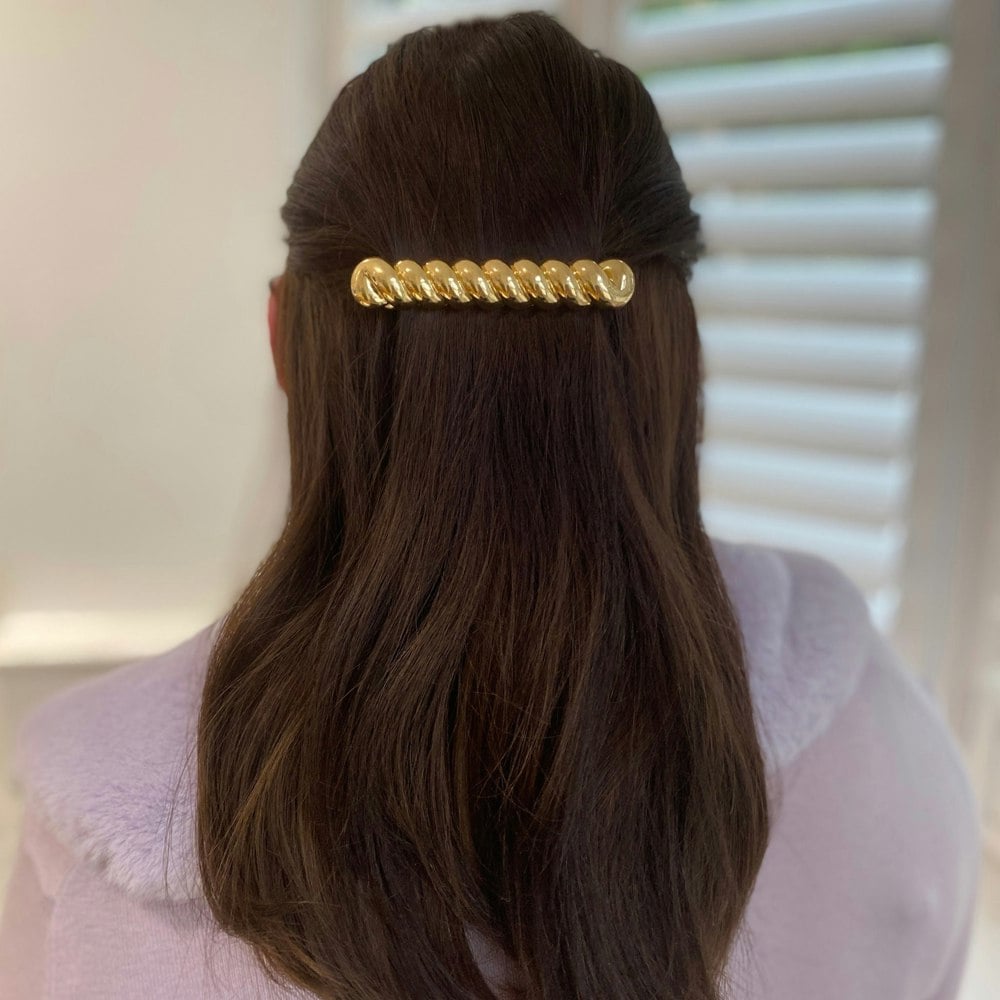 This large gold hair clip for thick hair gleams seductively, to add a bit of glam to your day.