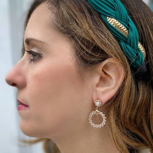 The earrings feature a chic, pearl stud top, with a circular drop, set with dozens of tiny pearls. Trimmed in gold, for a vintage-inspired look.