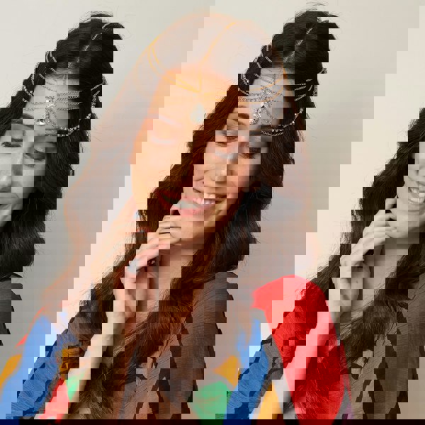 There is a hair chain to wear down your parting, and there are three drop chains on either side of the central rhinestone. One of these is set with glittering diamante.