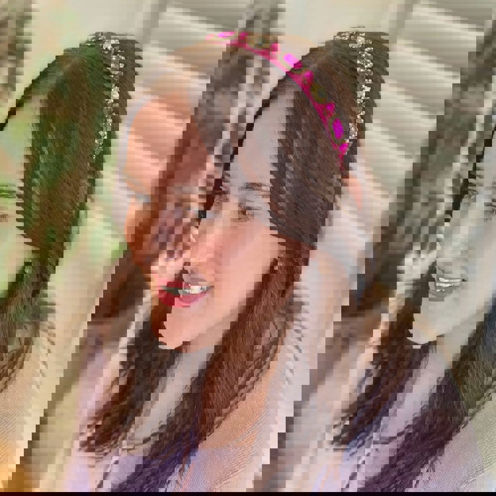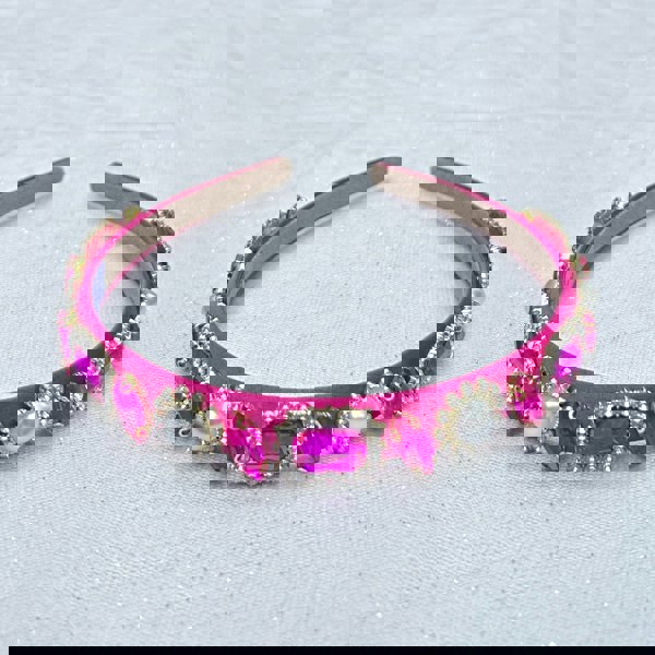 This hot pink jewelled headband is easy to wear, and delightfully pretty.