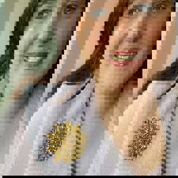 This large, vintage inspired flower brooch is a sizeable piece, and makes a sparkling and golden statement.