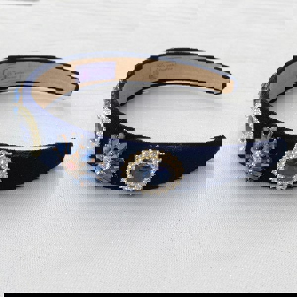 Navy blue headband, slim velvet band, embellished with pearls, oval blue gemstones, floral crystal clusters, rhinestone halo detailing, vintage inspired statement style, elegant decorative hair accessory, gift for her