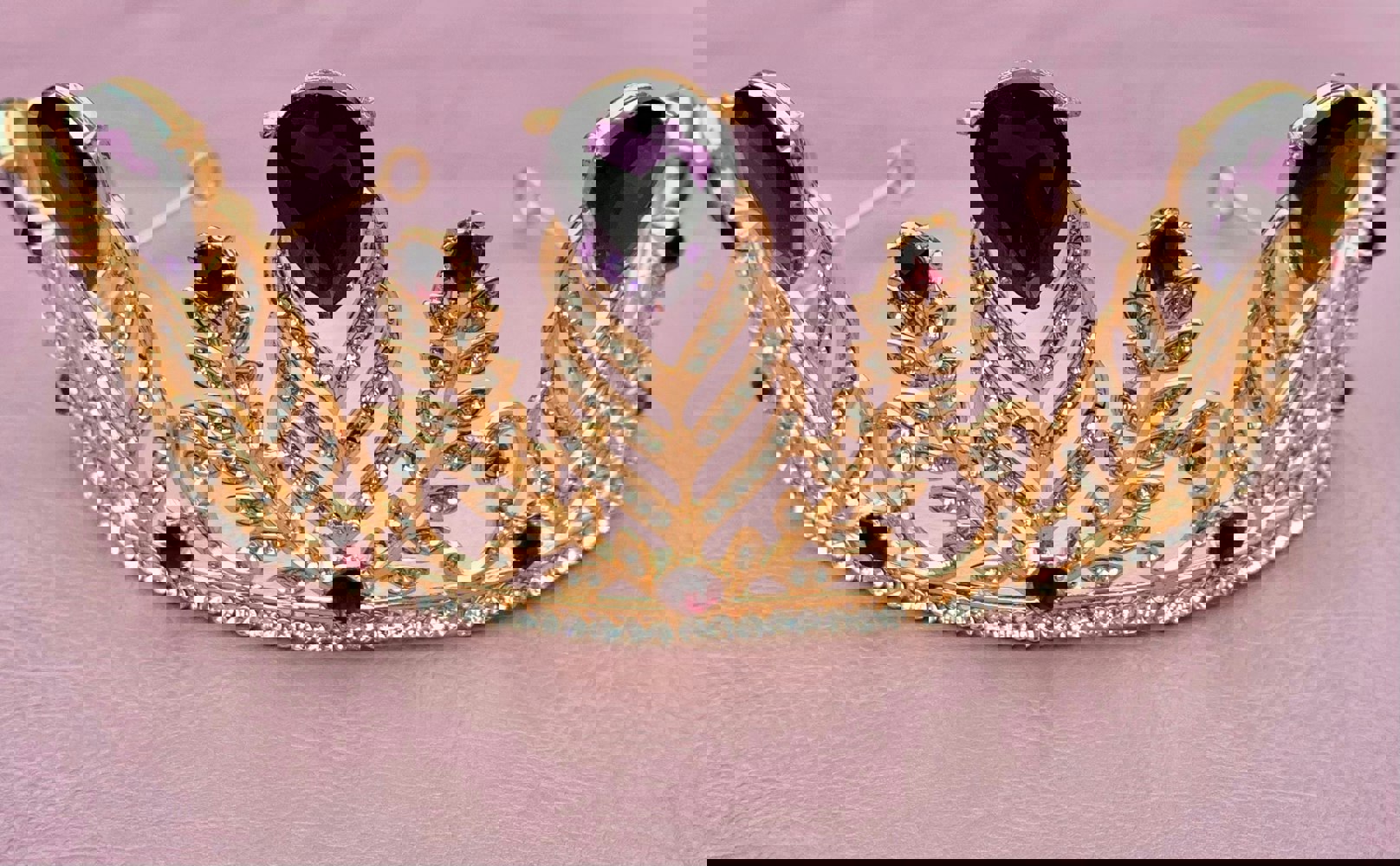 This purple tiara measures approximately 7.5cm tall x 16cm wide x 14cm deep