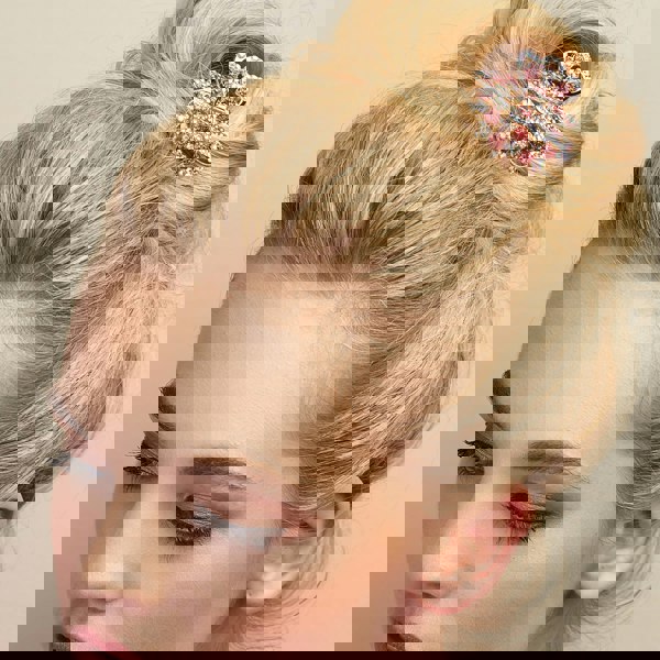 This clip also works very well as the finishing touch to a bun hairstyle, as you can see in our images. Whether it is a more formal updo for a wedding, or a messy bun for a weekend day, your rose gold hair clip will add colour and sparkle.