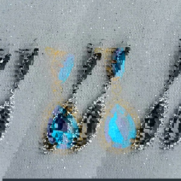 Crafted from a central teal gems, offset by sparkling diamante; these earrings are beautifully light as well as making a statement.