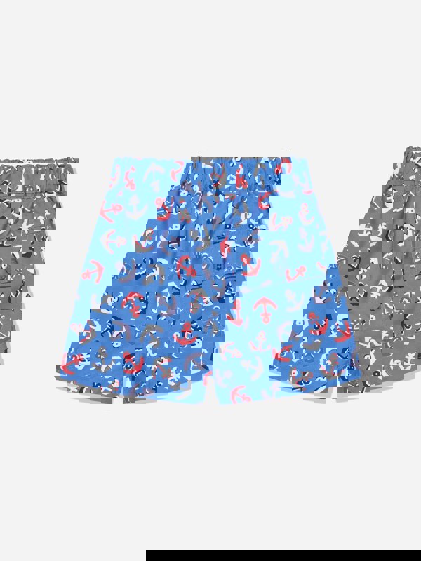 Rachel Riley baby boys anchor swim shorts in blue with an all-over anchor print. Made from 100% polyester, they include a mesh lining and an elasticised waistband for a secure fit. A back pocket with button adds a practical detail, and a spare button is included.