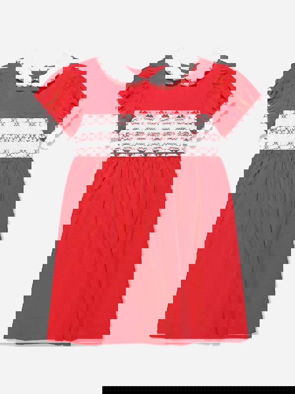 This baby girls set from Rachel Riley pairs a classic smocked dress with matching bloomers. The dress is made from cotton with a layered cotton lining and hand-embroidered detailing. A stitched ruched bodice sits beneath a white Peter Pan collar, finished with short puffy sleeves and red detailing.