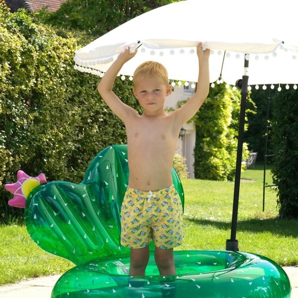 Rachel Riley boys swim shorts in coconut yellow. Mesh lining adds an extra layer, while the elasticised waistband keeps the fit secure for days by the water. A back pocket with button adds a practical detail, and a spare button is included.