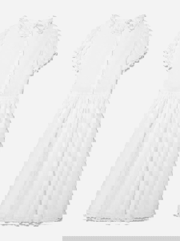 A flounced collar with lace trim frames the neckline, and short puffy sleeves complete the silhouette. The dress fastens with buttons at the back.