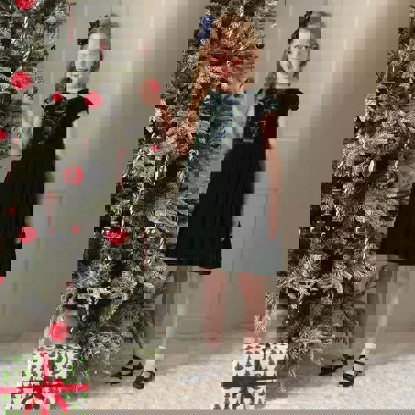 This girls dress from Rachel Riley comes in rich green velvet with navy tartan bows for a classic look. It has cap sleeves and a gathered skirt, with a zip fastening at the back. A cotton lining completes the piece.