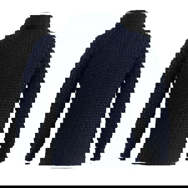 Boys navy moss stitch cardigan with a collar, pockets and pearl button front to fasten.