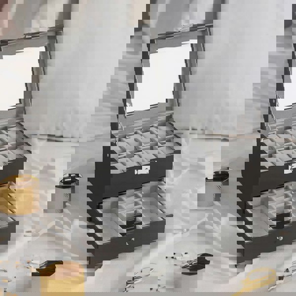 Ample Capacity: This watch storage box offers generous storage with an upper layer featuring 8 slots suitable for watches with dials up to 48 mm in size. The bottom drawer provides additional compartments for organizing necklaces, rings, earrings, and other accessories efficiently. Secure and Durable: Crafted from high-quality synthetic leather and lined with soft velvet, this watch box ensures durability and gentle protection for your valuables. It includes a secure lock mechanism with two keys, offering peace of mind against unauthorized access. Clear Glass Lid: The transparent glass lid allows for easy visibility and quick access to your watches, while keeping them protected from dust and debris. The lid is sturdy and simple to clean, maintaining the pristine appearance of your collection. Ideal Gift: With its classy design and practical functionality, this watch box makes an excellent gift choice for watch enthusiasts. It enables them to showcase their collection in an organized and stylish manner. Alternatively, treat yourself to elevate your personal watch storage experience. Complete Set: Enjoy the convenience of a stylish 2-tier watch case that helps you effortlessly find the right accessories during busy mornings, saving you valuable time while keeping your watches and jewelry neatly stored.