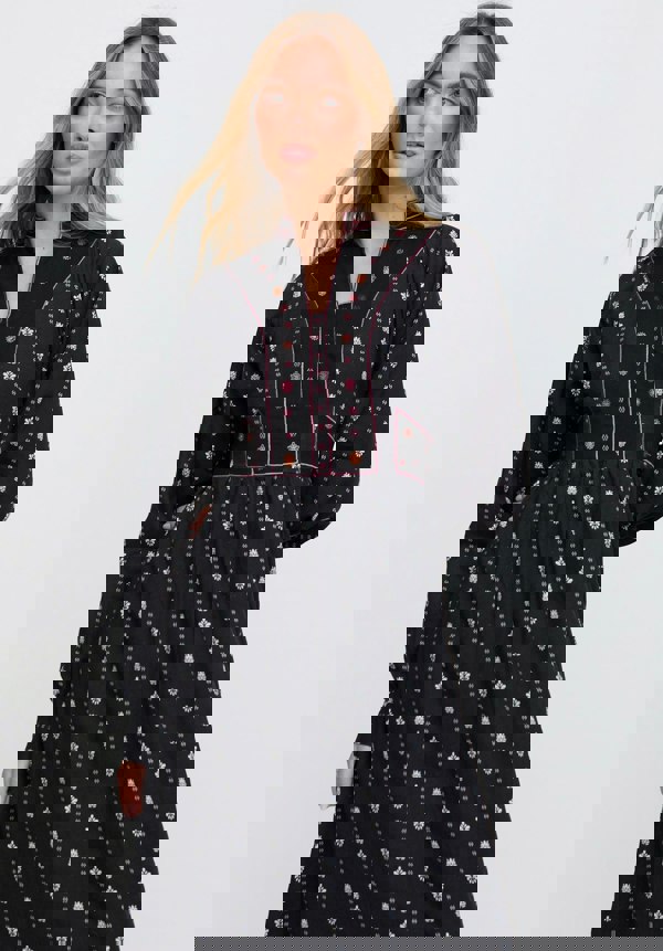 The Ocean maxi dress pairs timeless black with bold, contrasting embroidery for a striking boho statement. Featuring a block-print base, cuffed sleeves, and an open collar neckline, the look is elevated with an intricately embroidered bodice and a tie-back waist for effortless shape.