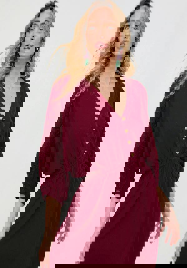 The Somerton maxi dress brings effortless elegance to a relaxed kaftan silhouette. Finished with intricate embroidery and flowing shape, it drapes beautifully in rich burgundy — an elevated boho piece designed for comfort and impact.