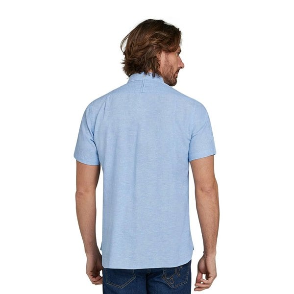 This classic short-sleeved shirt is made from a linen and cotton blend, finished in sky blue with a plain base and embroidered logo detailing. A turn-down collar and button-down fastening keep the look clean and traditional, making it a straightforward option for warm-weather dressing.