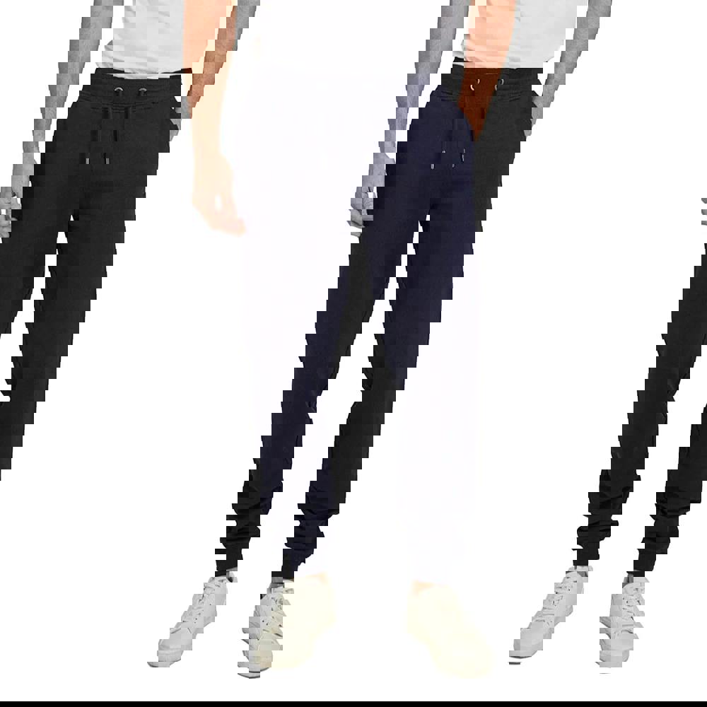These men’s cuffed jogging bottoms come in navy with a plain finish and logo detail. Made from an 80% cotton and 20% polyester blend, they offer a soft, durable fabric feel. An elasticated waistband with a drawstring allows for an adjustable fit, while the cuffed ankles create a neat, tapered outline.