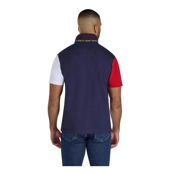 This rugby polo shirt is made from 100% cotton in a piqué finish. It comes in navy, white and red with a diagonal stripe design, finished with embroidered text and a crest detail.