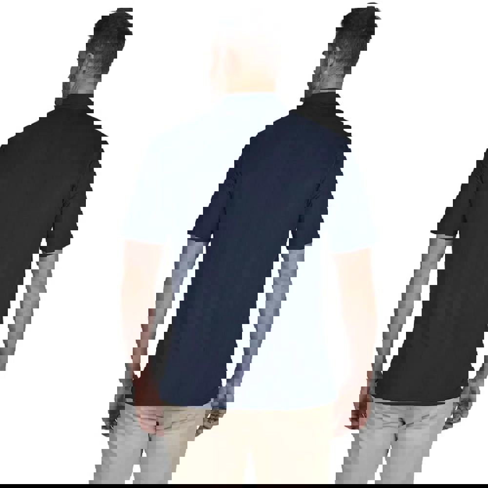 This men’s golf tech polo shirt comes in navy with a plain finish and logo detail. It is made from 95% cotton and 5% elastane, with stretch fabric technology for comfortable movement. A flat knit collar and short sleeves keep the look classic and suitable for golf and everyday casual wear.