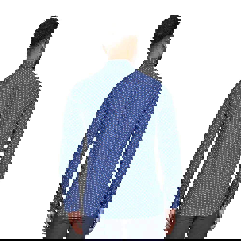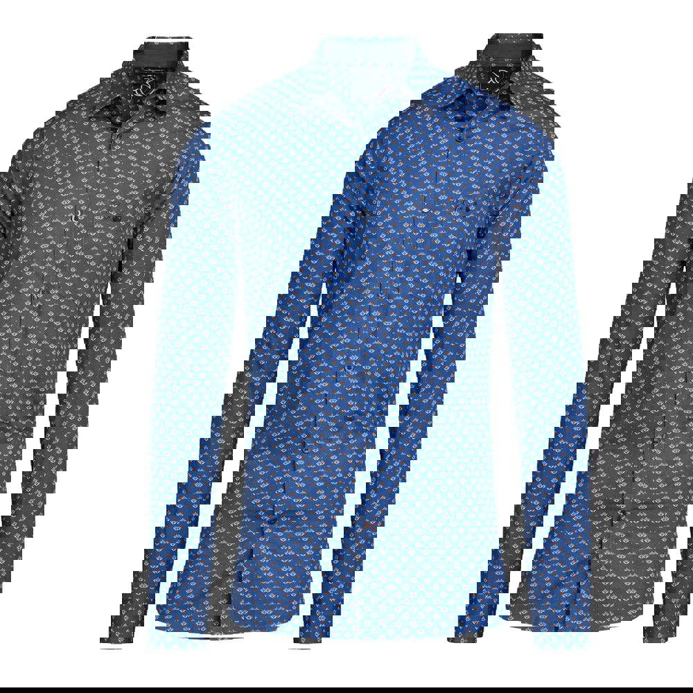 This long-sleeved shirt is made from 100% cotton and finished with a leaf print in navy and orange. A tailored fit and turn down collar give it a clean, structured look, while the central back pleat adds shaping through the body.