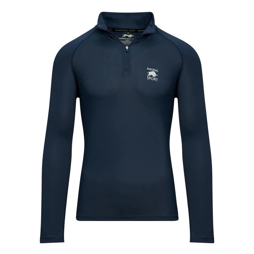 This men’s performance track top from Raging Bull is made from 100% polyester and comes in navy. It has a collared neckline with a quarter zip, paired with long sleeves for a clean, sporty profile. The pull over construction keeps the finish streamlined, while the back print and logo add branded detail.