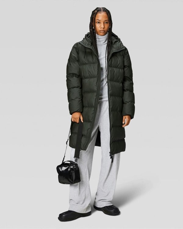 Rains Alta Long Unisex Puffer Jacket in 03 Green