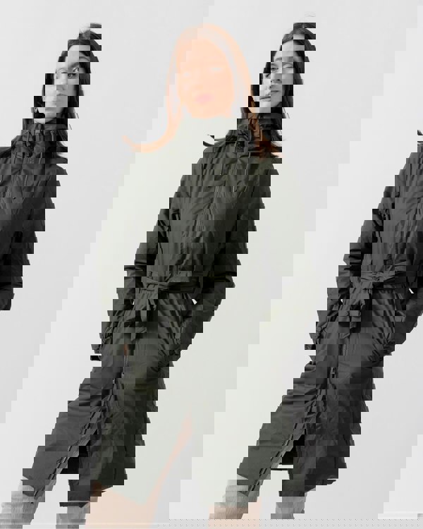 The style features concealed fleece-lined side pockets, elasticated cuffs and an insulated hood with drawstring adjustment. Completed with a belt to accentuate the waist, this long jacket is easily fitted for an individual silhouette.