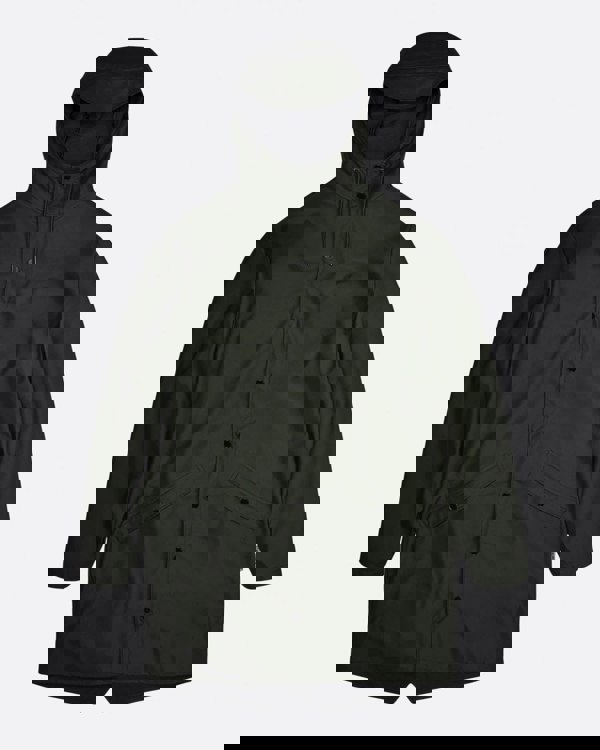 This rain jacket is a long version of Rains' classic rain jacket. It features a placket with snap fastenings for closure, hood with built-in cap and two side pockets with snaps. Sleeves are finished with snaps making them adjustable for a loose or tight fit.