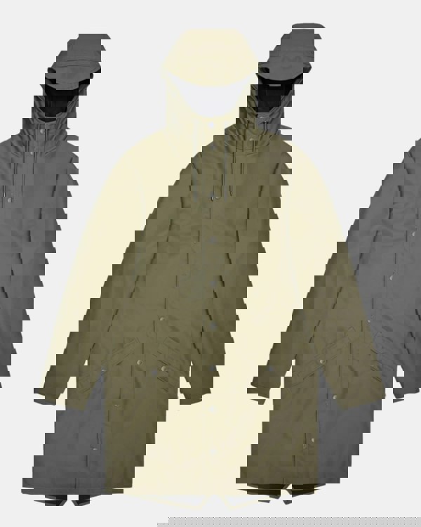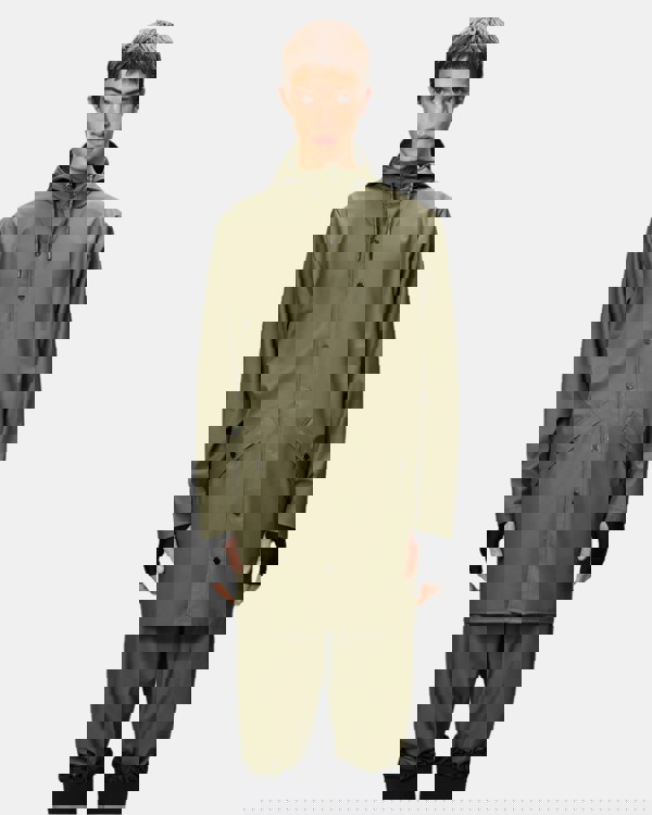 This rain jacket is a long version of Rains' classic rain jacket. It features a placket with snap fastenings for closure, hood with built-in cap and two side pockets with snaps. Sleeves are finished with snaps making them adjustable for a loose or tight fit.