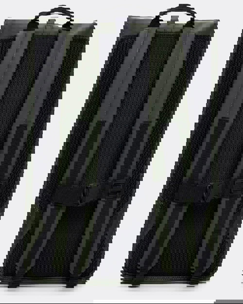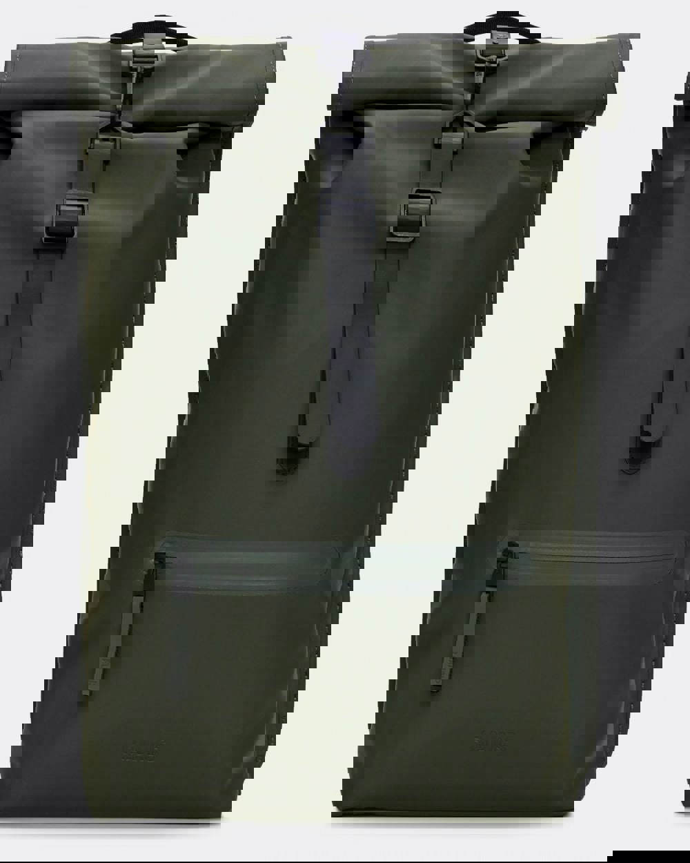 Rolltop Rucksack is cut in Rains’ signature waterproof PU fabric, engineered for carrying strength, durability, and a smooth feel.