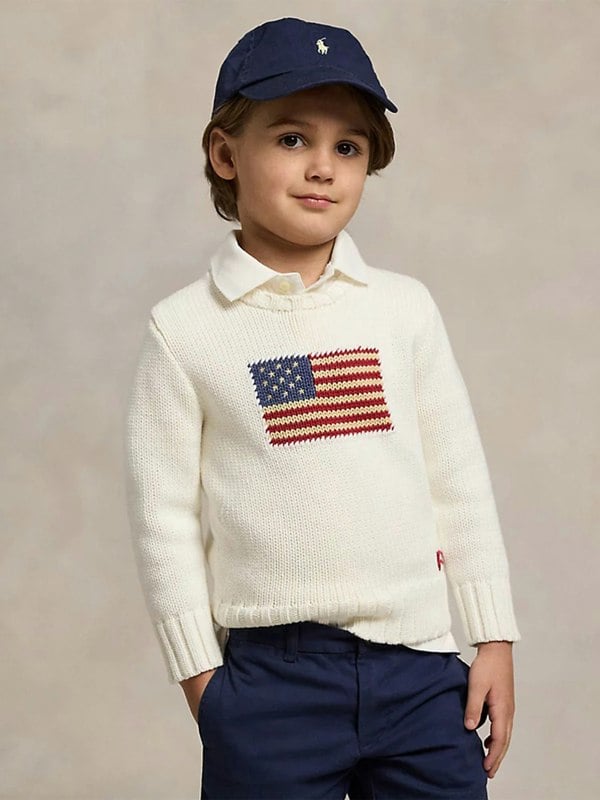 This boys’ cotton knit jumper by Ralph Lauren comes in an ivory colourway with an embroidered flag motif. The knit construction keeps the look classic and easy to wear across different occasions.