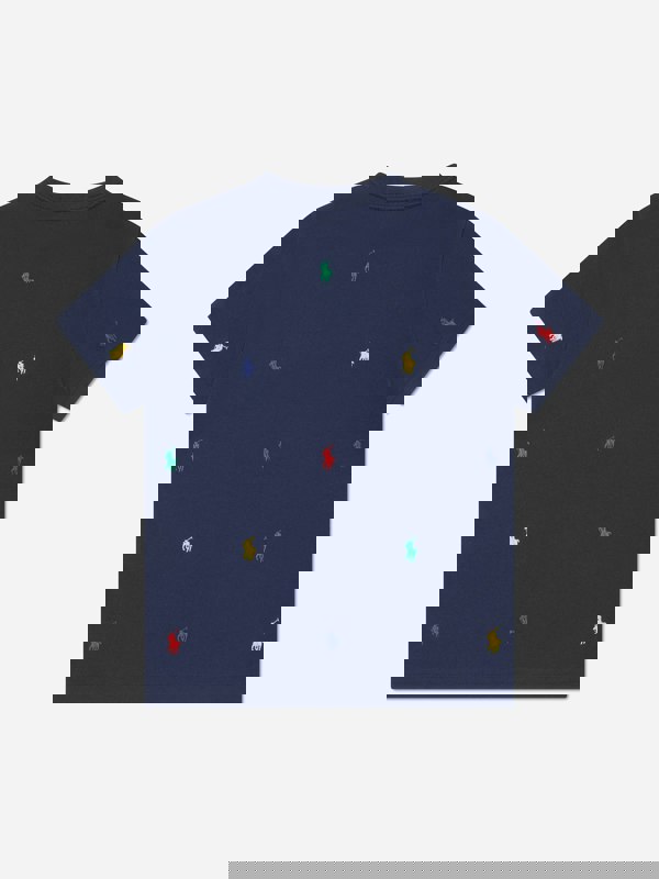 Ralph Lauren Kids presents this navy short sleeve T-shirt for baby boys. It has a crew neck and a straight hem, finished with all-over multicoloured embroidered logos. Snap buttons complete the design.