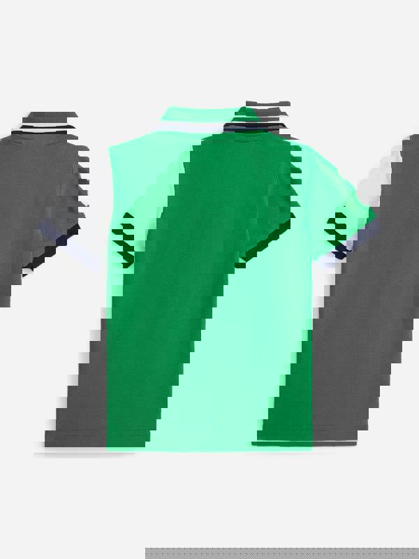 Ralph Lauren Kids brings a baby boys polo shirt in green with a colourblock design and diagonal border detail. The style includes a collar and short ribbed sleeves for a classic polo shape. An embroidered Polo Bear and number 2 add a distinctive branded finish.