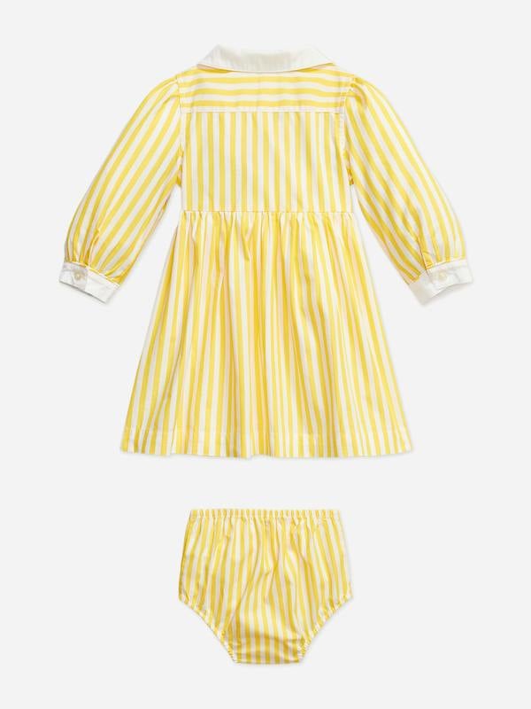 This Ralph Lauren Kids shirt dress combines canary yellow and white stripes with a classic collared neckline. Made from 100% cotton poplin, it has a front button placket for a neat, traditional finish. Long sleeves and a flared hem complete the silhouette, while the embroidered Polo Player logo adds a signature detail.