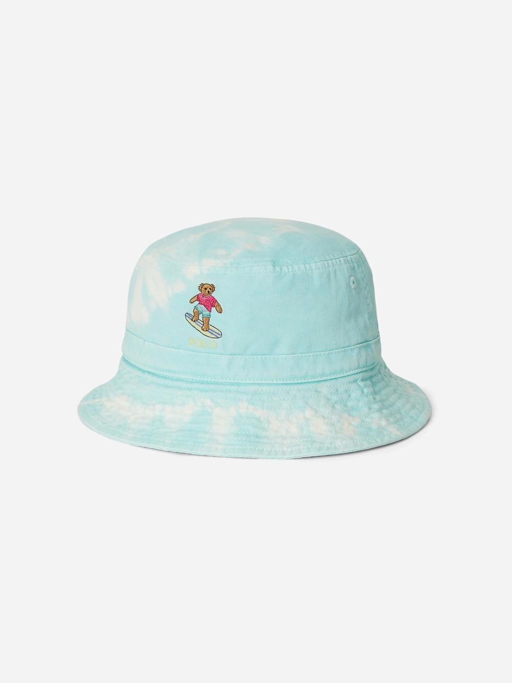 This Ralph Lauren Kids bucket hat comes in blue and includes a Polo Bear motif in a vibrant tie-dye pattern. A distinctive addition to an SS2026 wardrobe, it brings a recognisable Ralph Lauren signature to everyday outfits.